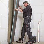 De inloopdouchewand bestaat uit één enkele wedi bouwplaat XL 50 mm. Breng wederom de wedi 610 op de aansluitkanten van de wedi XL aan. Doe hetzelfde op de aansluitkant van de wedi Fundo Plano. Plaats vervolgens de wand en stel deze waterpas. Voorzie tenslotte de overige horizontale en verticale aansluitnaden in de inloopdouche van wedi 610 en strijk deze af.