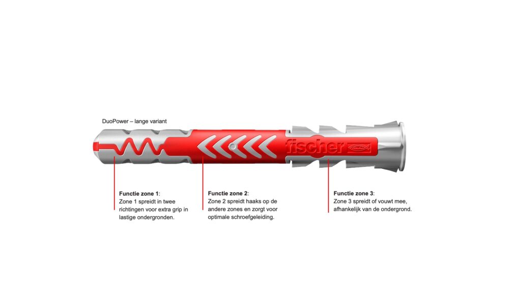Op zoek naar een plug die altijd blijft zitten? De Fischer DuoPower is onderdeel van de slimme Fischer DuoLine: een serie nylon bevestigingsoplossingen die staan voor montagegemak en topprestaties in elke situatie. Deze innovatieve lijn is speciaal ontwikkeld voor vakmensen die geen concessies willen doen aan kwaliteit, snelheid of gebruiksgemak. Of je nu een tv-steun monteert, een kast ophangt of werkt aan een overkapping – met de DuoLine zit je altijd goed.